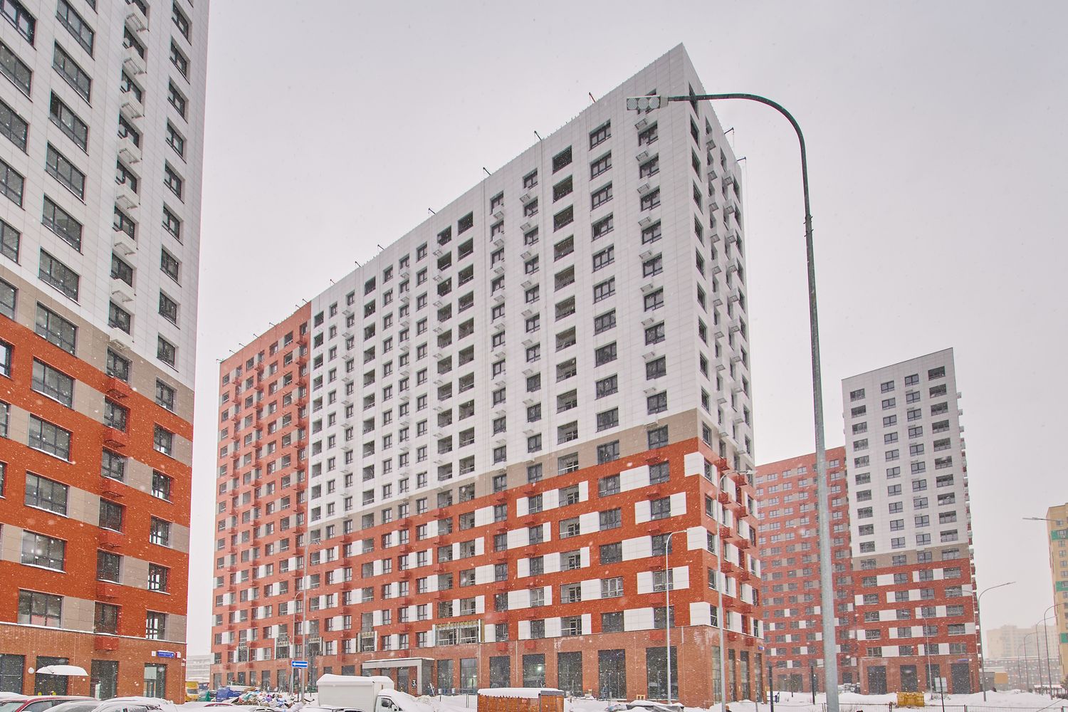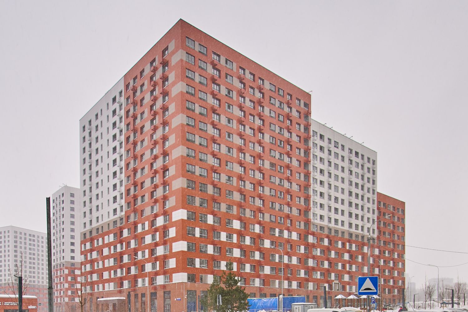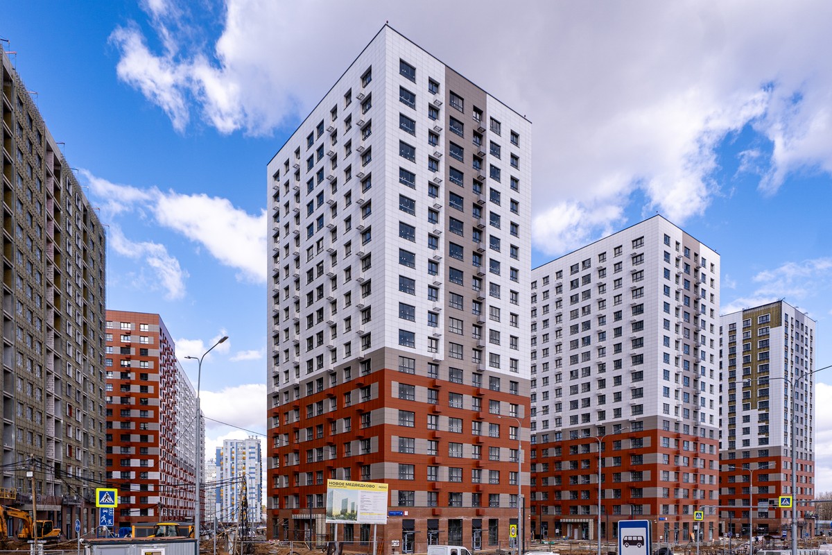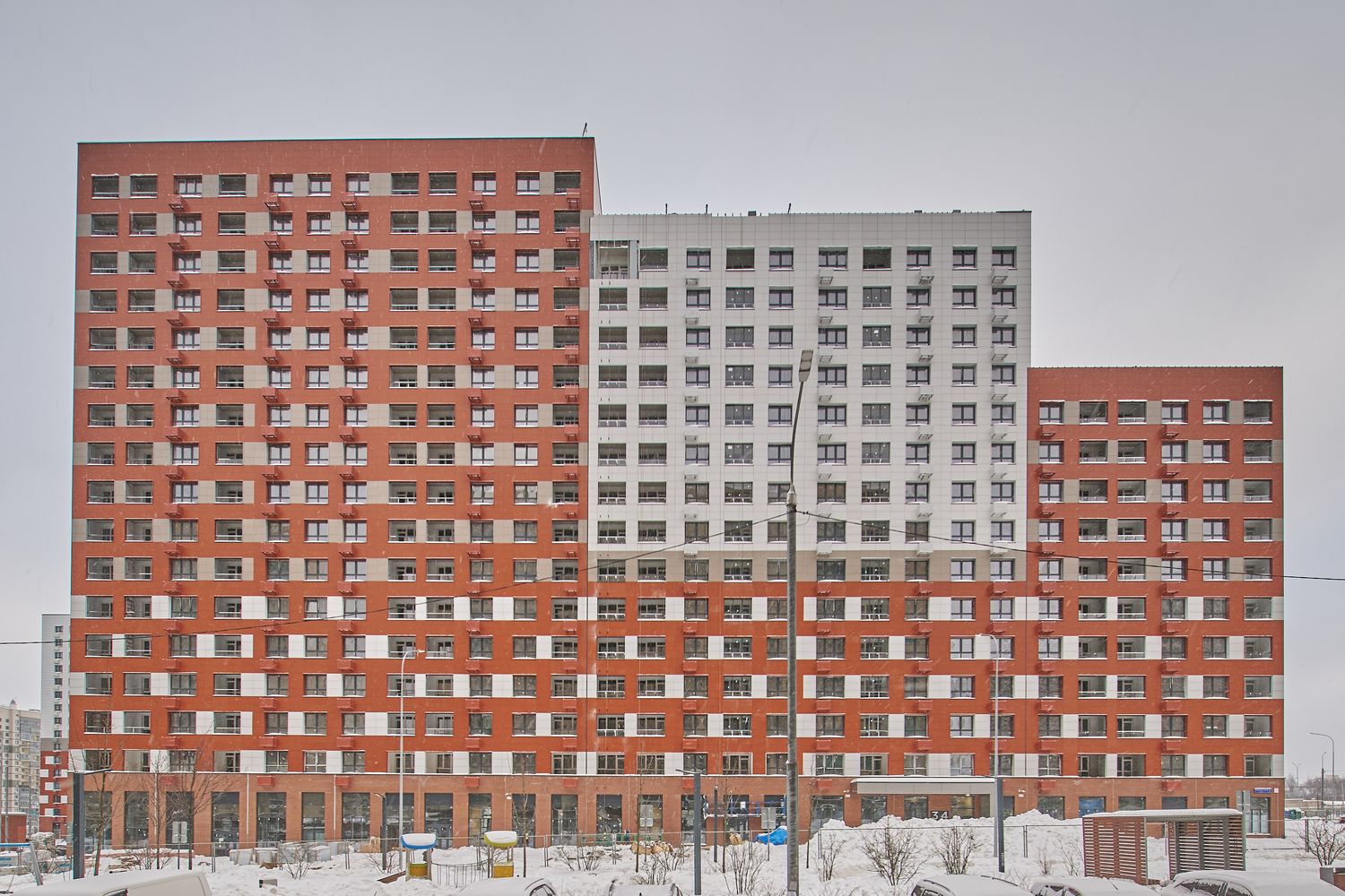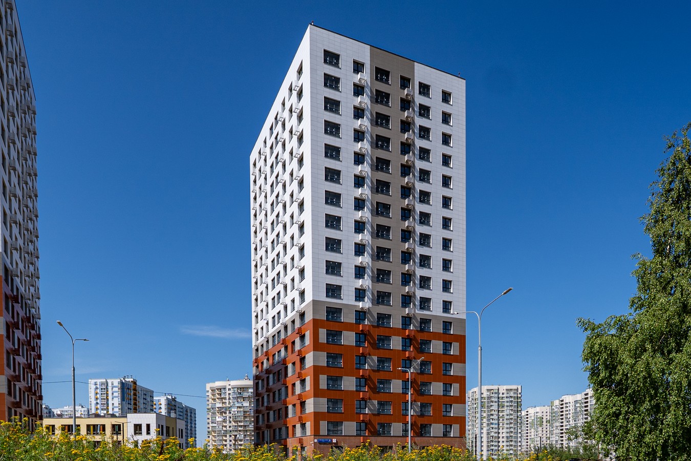 - Корпуса 35 и 39: монтируем навесной фасад, рамы лоджий, витражные конструкции первых этажей, благоустраиваем придомовую территорию.