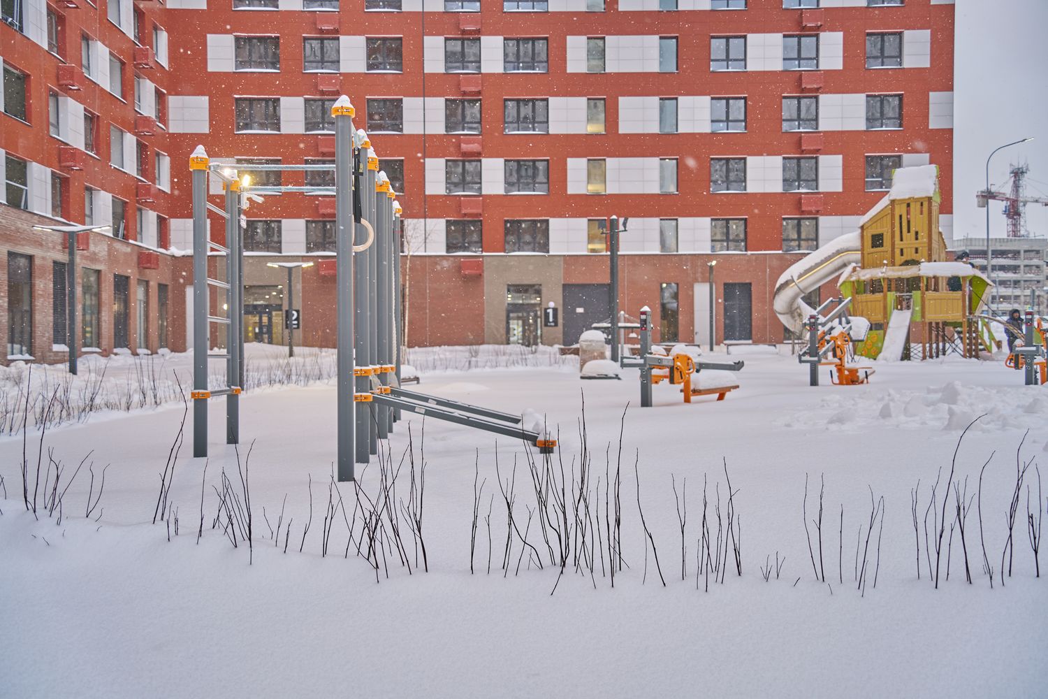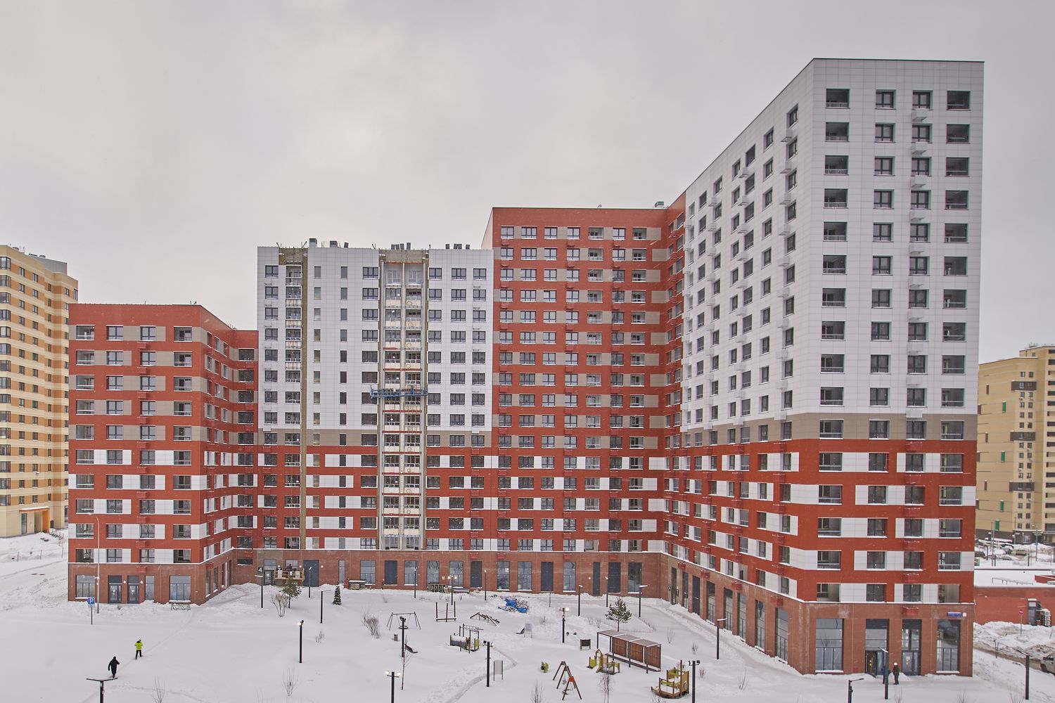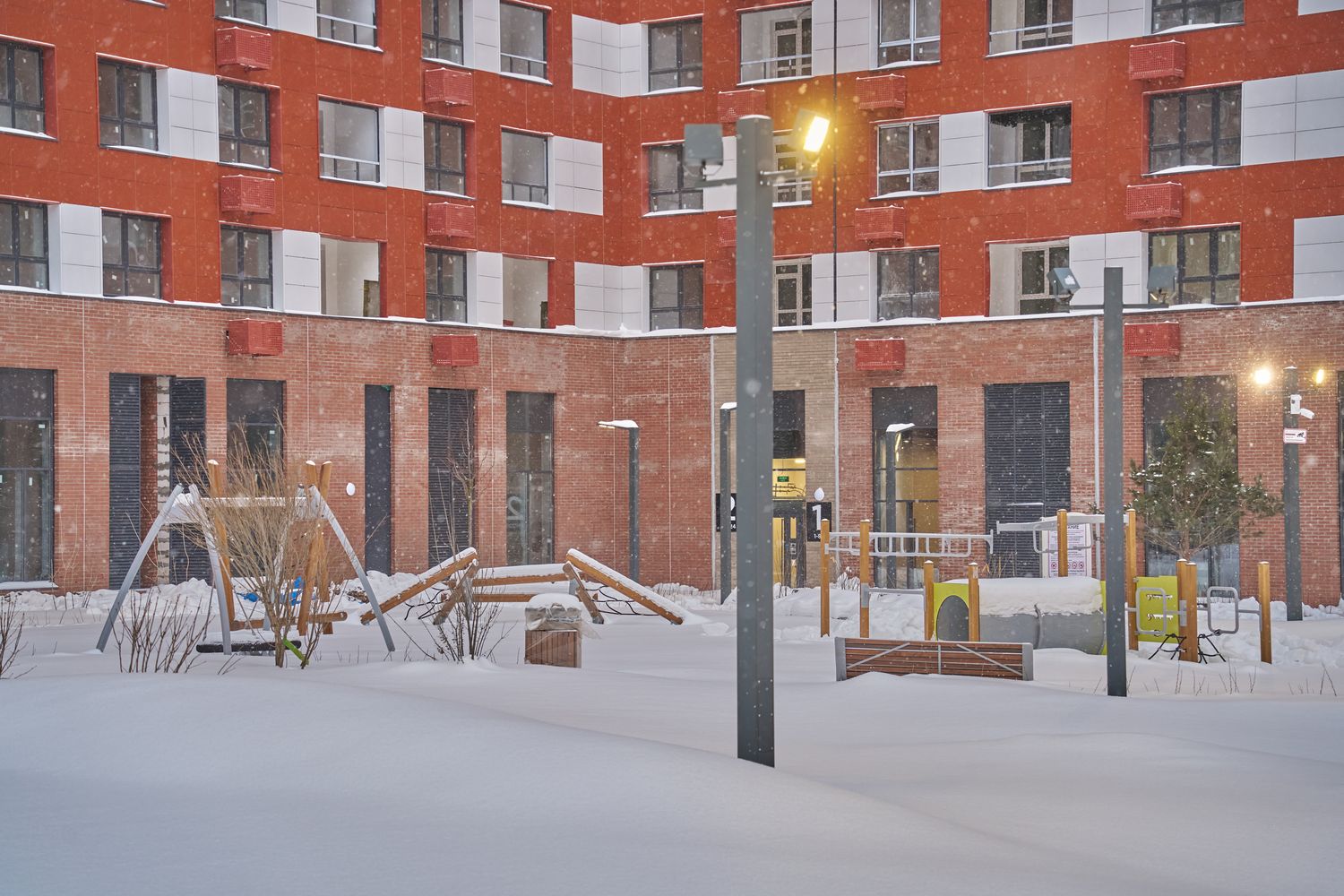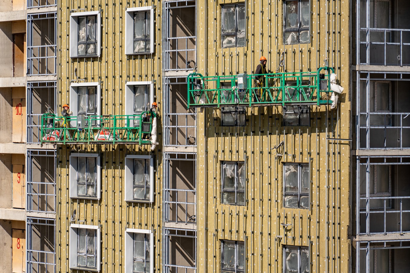 - Корпуса 35 и 39: монтируем навесной фасад, рамы лоджий, витражные конструкции первых этажей, благоустраиваем придомовую территорию.